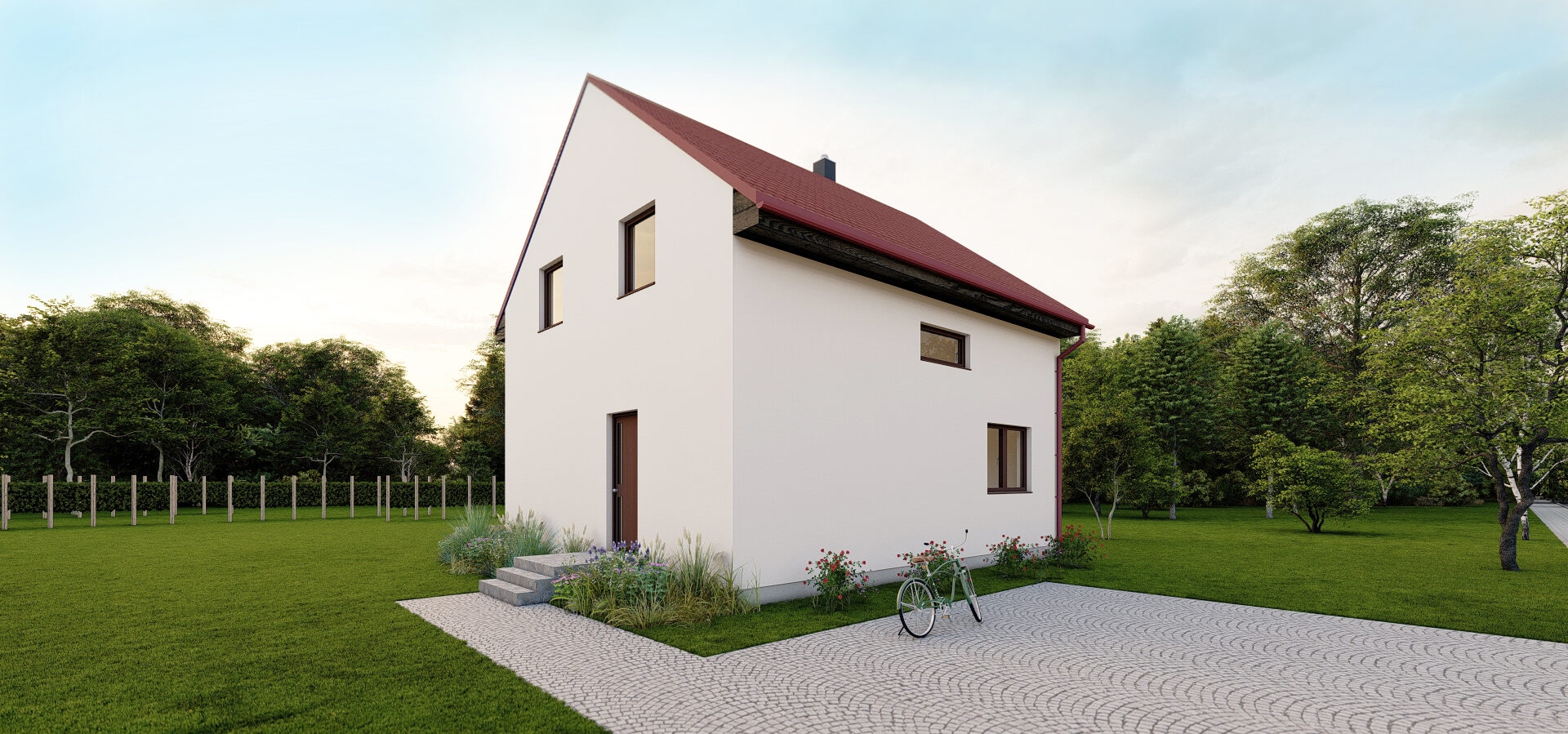 Náročné požadavky na bydlení mladé rodiny v kombinaci s malou zastavěnou plochou splňuje právě dům Rosé. Dispozice přízemí s útulným a dostatečně prosvětleným obývacím pokojem, jídelnou a kuchyní je obohacena o malý pokojík, který může být využíván jako pracovna nebo hostinský pokoj pro dědečka s babičkou, kteří přijedou na návštěvu a nebudou muset chodit po schodech. Samozřejmostí je i koupelna se sprchovým koutem a toaleta. Podkroví poskytuje dostatek místa a pohodlí pro čtyřčlennou rodinu. Pokud požadujete tak akorát velký dům se vším potřebným, který uspokojí svou dispozicí a atraktivním vzhledem i náročné zákazníky, pak je tento dům určen právě Vám.