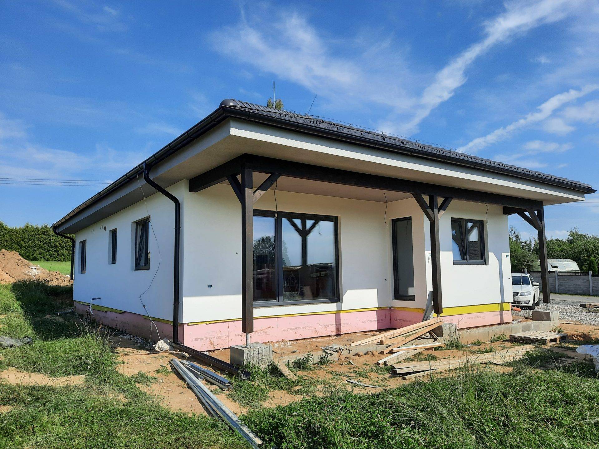 Dům je navržen jako montovaná dřevostavba v certifikovaném stavebním systému DMK, konkrétně je na obvodové stěny použit panel DMK Difu s difuzně otevřenou skladbou, vnější dřevovláknitou deskou tl. 100 mm a dodatečně zateplenou instalační předstěnou tl. 60 mm. Prostor mezi nosnými sloupky (KVH 60/140 mm) panelu je vyfoukán celulózou. Výhodou této skladby je skvělá akustika a především značný fázový posun (cca 15 hodin), díky kterému se při vhodném zastínění jižních okenních výplní naše dřevostavby v létě nepřehřívají. Součinitel prostupu tepla U se pohybuje okolo 0,15 W/m2K v závislosti na tom, jaká tepelná izolace v předstěně případně mezi nosnými sloupky se zvolí. Ve výrobě byla do stěnových panelů osazena okna DafePlast Progress s oboustrannou imitací.