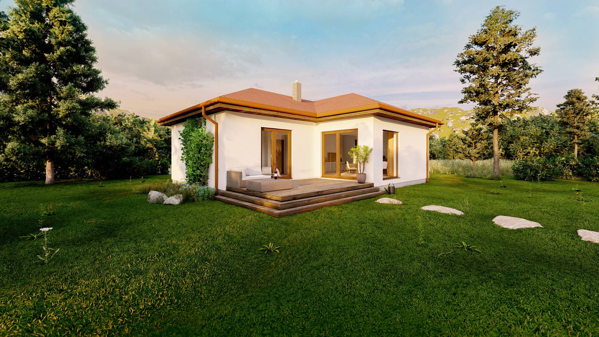 V atraktivním domě ve tvaru písmene L najdete vše, co budete potřebovat. Obývací pokoj s kuchyní je osvětlen slunečními paprsky ze třech stran a tak se světlo stává příjemným společníkem Vašeho domova. V prostorné ložnici s dostatkem místa pro kompaktní vestavěné skříně je možné zařídit malou pracovnu. Zdařilou dispozici domu doplňuje dětský pokojík nebo ložnice pro hosty, samostatné WC, velká koupelna s oknem a nezbytná technická místnost, kde je dost místa i na pračku. Vlastní rukopis domu Sonberk zaručí jeho jedinečnost.